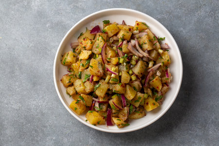 Traditional German potato salad with pickles, red onions and apple, top view.