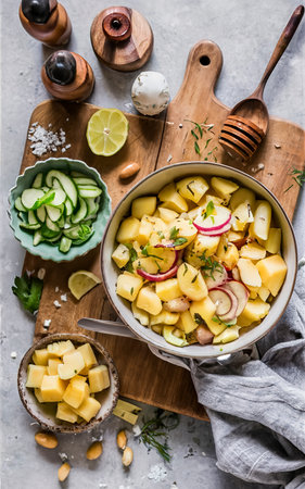Cooking Traditional German potato salad - Kartoffelsalat. Gray background. Top view