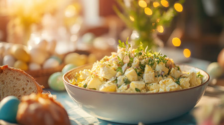 A close-up of a delicious Easter egg salad and fresh bread served at a brunch table, surrounded by decorative Easter eggs and soft lighting. -