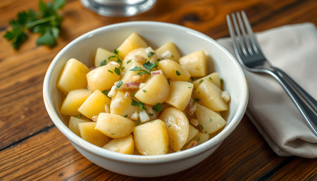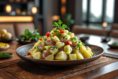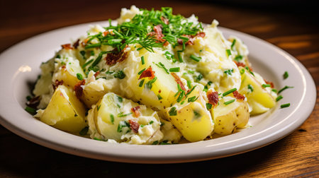 An AI generated illustration of a white plate filled with a tempting potato salad, set against a wooden table