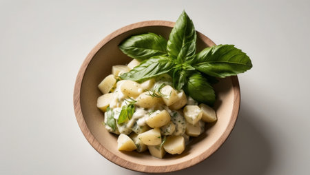AI Generated. Fresh basil and potato salad in a wooden bowl