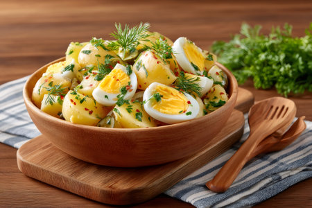 Potato salad with boiled eggs, dill and parsley dressing in wooden bowl on wooden table