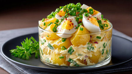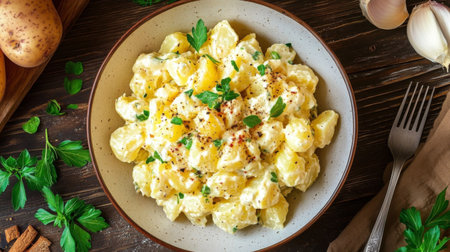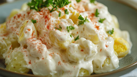 A delicious potato salad topped with creamy dressing, fresh herbs, and a sprinkle of paprika is served on a plate, perfect for summer barbecues and picnics.