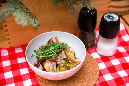 Potato salad in a deep bowl, garnished with microgreens. Boiled potatoes, onion slices, pickled cucumber, radish slices.