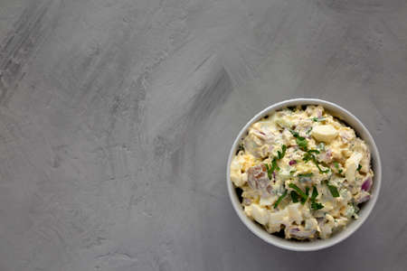 Homemade Healthy Potato Salad with Eggs in a Bowl on a gray surface, top view. Flat lay, overhead, from above.