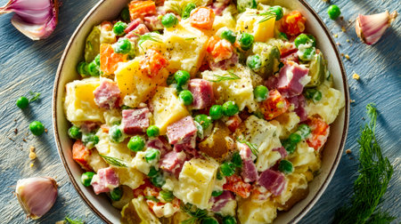 Creamy chilled salad featuring diced potatoes, savory ham chunks, vibrant peas, and fragrant herbs, served in a rustic ceramic bowl for a homey vibe.