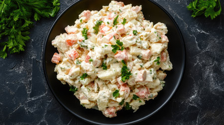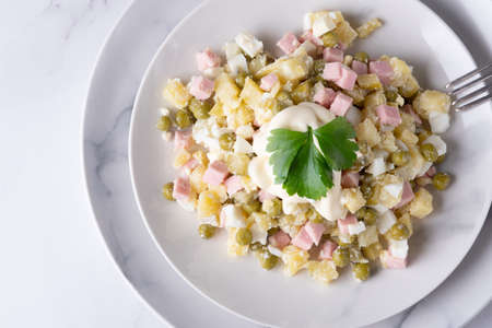 Russian olivier salad decorated with parsley. Top view.