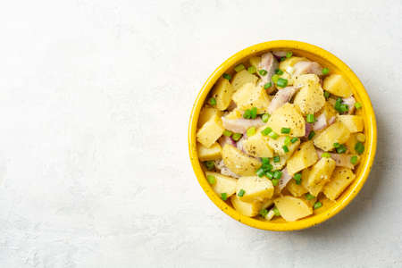 Potato salad with salted herring and onion in ceramic bowl on concrete background. Top view, copy space.