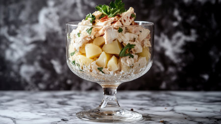 Classic Russian layered salad with potatoes, cheese, and chicken in a glass, modern plating on a minimalist marble surface