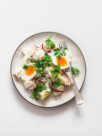 Classic potato and boiled egg salad with red onion and cilantro on a light background, top view