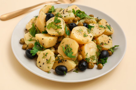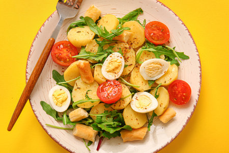 Plate of tasty Potato Salad with vegetables on yellow background