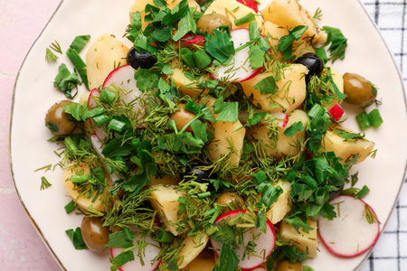 Plate of tasty Potato Salad with greens and radish on pink tile background