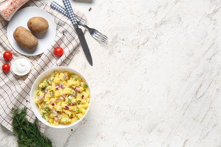 Potato salad with radish and dill on a light background