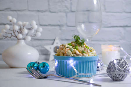 olivier salad in a plate christmas background