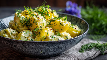 Potato salad with dill and sour cream in a rustic style