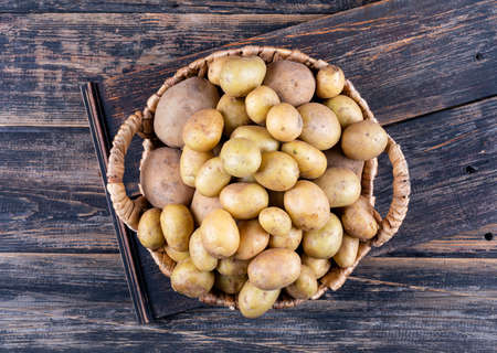 Some of potatoes in a basket on dark wooden background, flat lay.