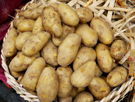 Food Vegetables Fresh New Potatoes, Background. Potatoes pattern for sale in market. Agriculture and vegetables product.