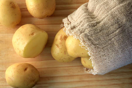 Fresh potato ready for cooking with potato sack background - potato cooking concept