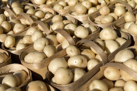 Background image of white potatoes in wood baskets at a farmers market