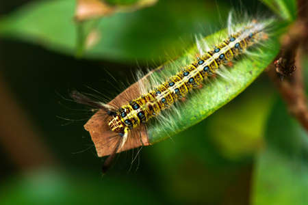 Grass moth, acronicta rumicis larvae, caterpillar climbing on leaves. Macro animal