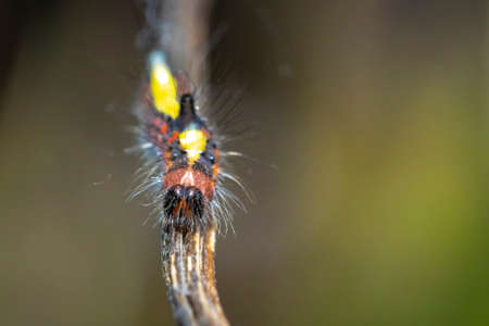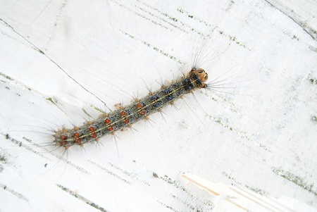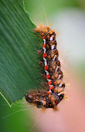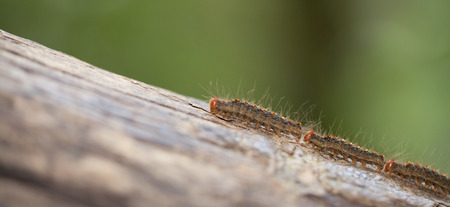 Hairy caterpillar with red and white dots beautifully bent on a piece of wood