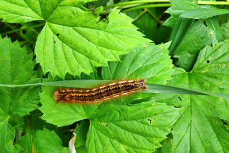 Many caterpillars on the leaf. Malacosoma castrensis, ground lackey. close-up.