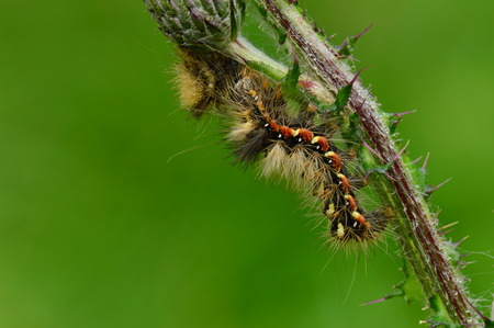 Fluffy caterpillar butterfly on a thistle stalk summer morning