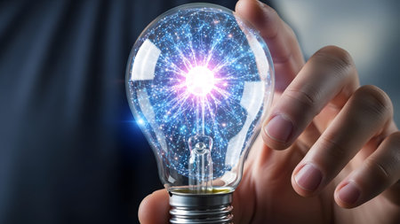 A captivating close-up of a glowing light bulb grasped in a hand, creating a beautiful contrast against a softly blurred backdrop that inspires creativity and bright ideas.