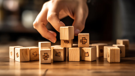 Close-up hand is placing wood block tower stacked in stair step with caution to prevent collapse or crash concepts of financial risk management and strategic planning.