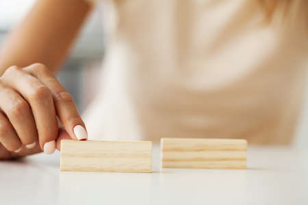 Hands of businesswomen playing wooden block game. Concept Risk of management and strategy plans for business growth and success.