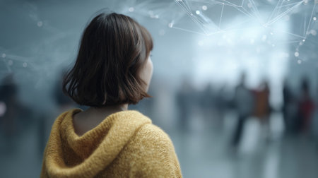 Profile of a woman standing against a backdrop of glowing blue network connections, symbolizing technology, innovation, and digital communication