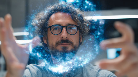 A modern man in contemplative pose wears sleek glasses, with luminous data nodes forming a web of ideas around his head, symbolizing cutting-edge intelligence and digital innovation