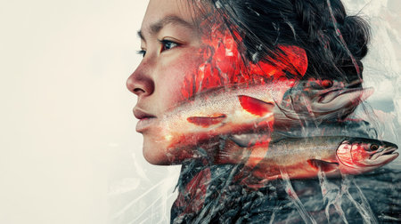 A young woman gazes thoughtfully as vibrant fish images merge with her profile, symbolizing the harmony and coexistence of humans and nature in a vivid artistic expression.