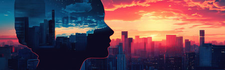 A silhouette of a young man merges with a vibrant skyline at sunset, symbolizing creativity and aspiration.