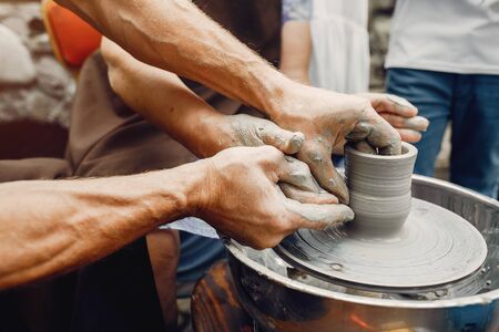 Workshop on modeling of clay on a potter's wheel. The master teaches the student to work with clay