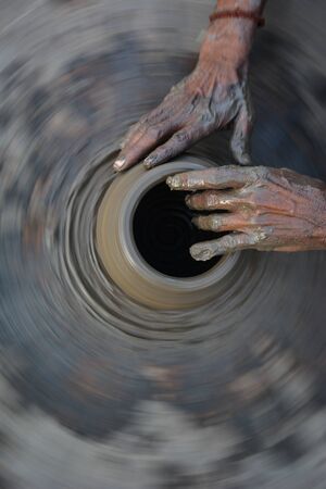 Hands of craftsman artist working on pottery wheel.Selective Focus