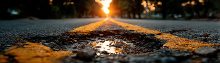 Asphalt road features a prominent hole with yellow lines, reflecting sunlight, surrounded by trees, showcasing a blend of urban decay and natural beauty