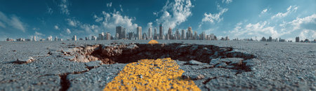 A yellow traffic line on a cracked asphalt street directs the view toward a city skyline, with a vibrant blue sky and clouds enhancing the urban atmosphere