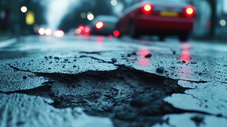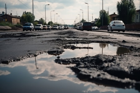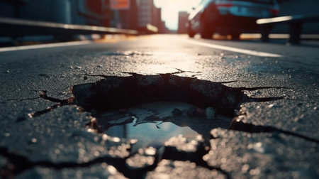 Damaged City Street: Close-Up of Potholes in Asphalt Pavement. Generative ai. High quality illustration