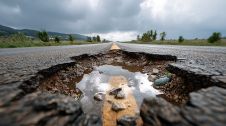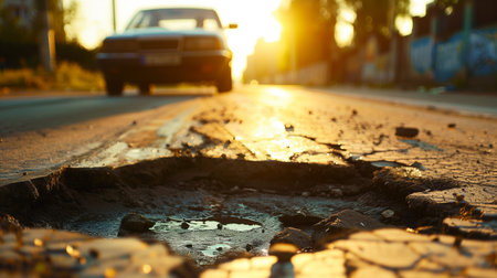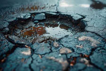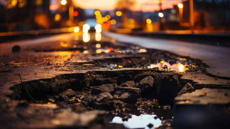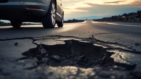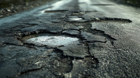 The photo is a close-up of a damaged road with holes in it. This demonstrates that our roads are not getting enough attention and there are problems with traveling.. Creative resource, AI Generated