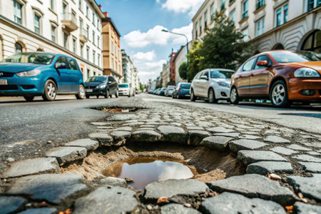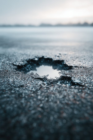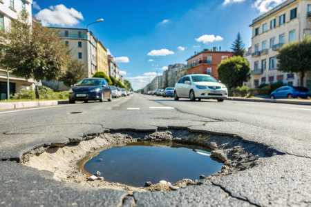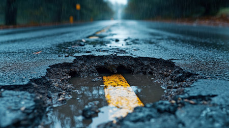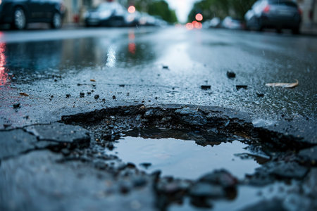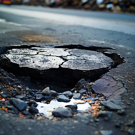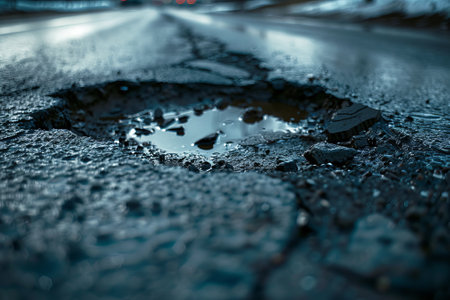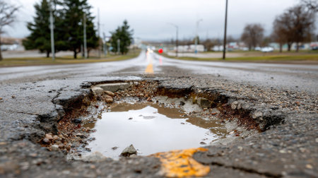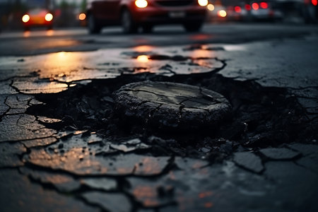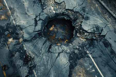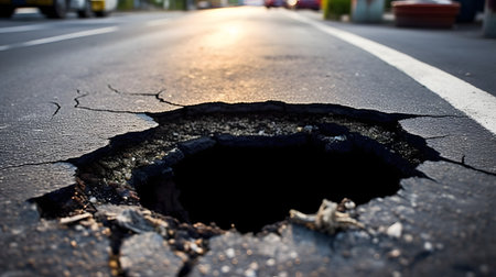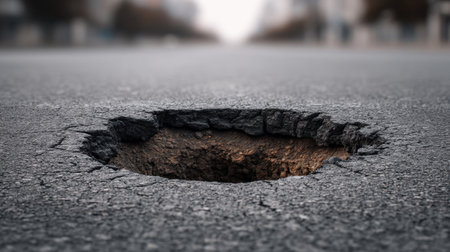 This image captures a deep pothole in an asphalt road, showcasing urban infrastructure issues. It emphasizes the need for maintenance and the risks posed to road users.