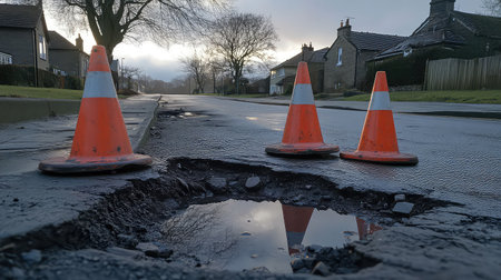 This image showcases a street scene featuring traffic cones placed around a pothole, reflecting the morning light. The tranquil setting highlights road safety and infrastructure concerns.