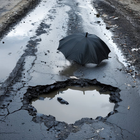 A striking image featuring a black umbrella by a large puddle in a pothole on a rough road. This visual captures the essence of urban decay and weather challenges.