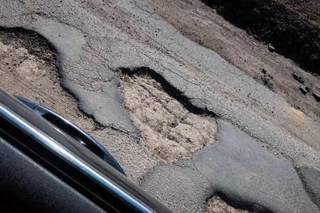 Road damage caused by potholes in the asphalt of the roadway