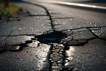 Broken asphalt and cracks on the road surface