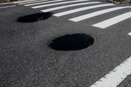 Dangerous deep holes on an asphalt highway near a pedestrian crossing. Danger of injury. Road closure. The need for urgent repair of the roadway.