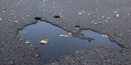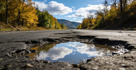 Pothole in the asphalt filled with water on an autumn day