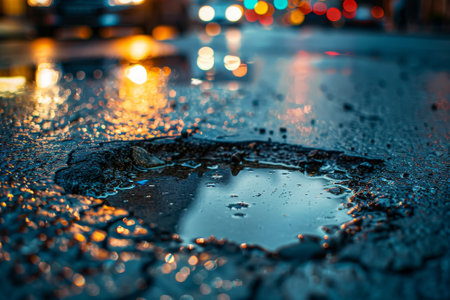A puddle of water sits in the middle of a cracked road. The water is reflecting the lights of the cars and the street. The scene is quiet and peaceful, with no one around