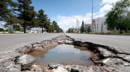 This image depicts a damaged urban road featuring a large pothole filled with water, mirroring the blue sky above. The quiet city scene showcases infrastructure issues.