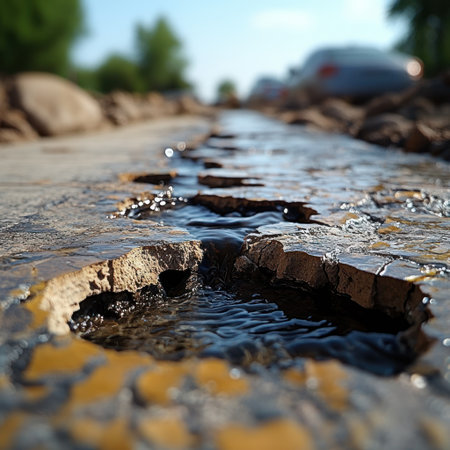 Water gathers in cracks of pavement, showcasing nature's persistence on a warm day.